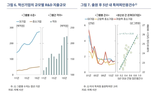 예를 들어 대기업(종업원 수 상위 5% 기업)은 전체 R&D 지출 증가를 주도하고 특허출원 건수도 크게 늘렸지만, 생산성과 직결된 특허 피인용 건수 등은 2000년대 중반 이후 눈에 띄게 감소한 뒤 이전 추세를 회복하지 못하고 있다.