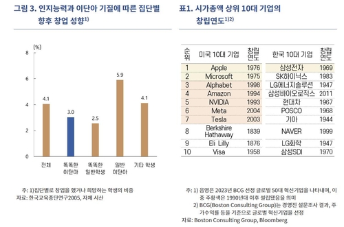 한은 경제연구원은 "미국 선행연구 결과 대규모 사업체를 운영하는 창업가는 주로 학창 시절 인지능력이 우수한 동시에 틀에 얽매이기 싫어하는 똑똑한 이단아"라며 "하지만 한국의 경우 똑똑한 이단아는 창업보다 취업을 선호하고, 그 결과 시가총액 상위를 여전히 대부분 1990년대 이전 설립된 제조업 대기업이 차지하고 있다"고 지적했다.