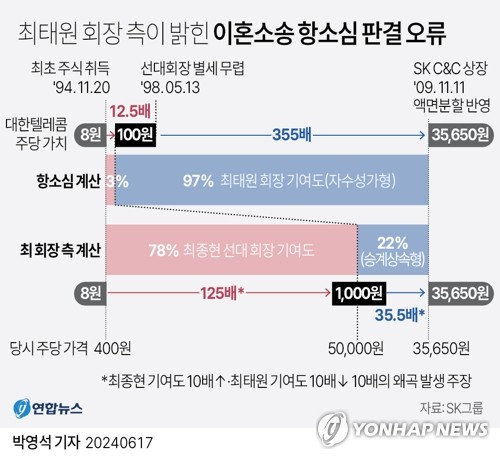 항소심 재판부가 현재 SK그룹의 지배구조 정점에 있는 SK㈜의 모태가 된 대한텔레콤의 주식 가치를 잘못 산정하며 최태원 회장의 기여도가 최종현 선대회장의 기여도보다 훨씬 크다고 전제한 것이 재산 분할 산정의 근거가 됐다고 보기 때문이다.