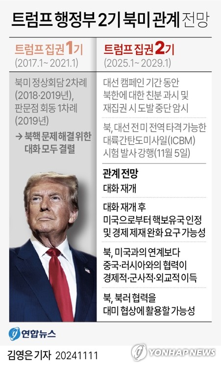 (워싱턴=연합뉴스) 박성민 특파원 = 도널드 트럼프 미국 대통령 당선인이 대선 과정에서 김정은 북한 국무위원장과의 친분을 줄곧 부각했음에도 취임 후 그를 다루기 더 어려워질 것이라는 전망이 나왔다.