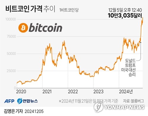 지난달 초 7만달러를 밑돌았던 비트코인 가격은 "친(親) 비트코인 대통령이 되겠다"고 공약한 도널드 트럼프 미국 대통령 당선인의 대선 승리 이후 상승세를 탔고 대선 승리 약 한 달 만에 10만달러 선까지 넘어섰다. 미 대선 이후 상승률은 약 45%에 이른다.