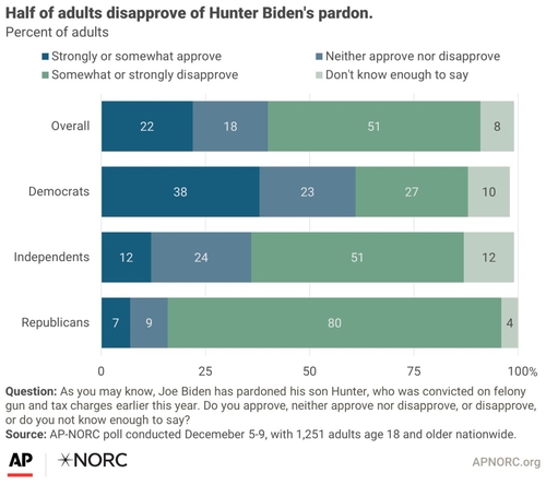 당별로는 민주당 지지지 가운데서는 38%만, 무당층에서는 12%만, 공화당 지지자는 7%만 각각 바이든 대통령의 차남 헌터 사면 결정을 찬성했다.