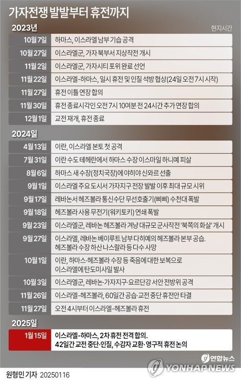 (제네바=연합뉴스) 안희 특파원 = 15개월의 전쟁 끝에 6주(42일)간의 휴전에 어렵사리 합의한 이스라엘과 팔레스타인 무장정파 하마스가 아슬아슬 살얼음판을 걷던 지각 휴전에 돌입했다.