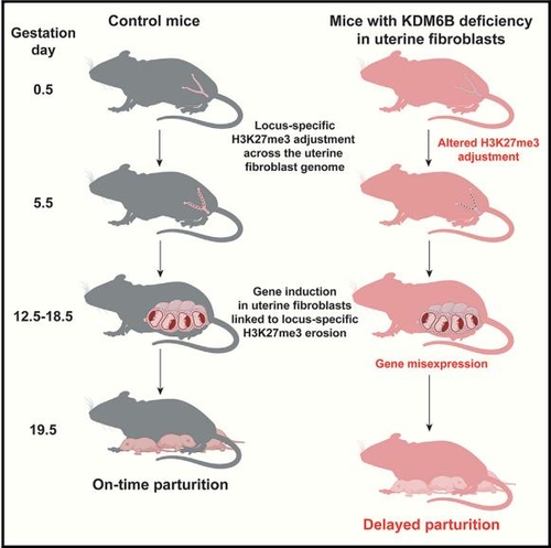 ◆ 출처 : Cell, Adrian Erlebacher et al., 'KDM6B-dependent epigenetic programming of uterine fibroblasts in early pregnancy regulates parturition timing in mice', https://www.cell.com/cell/fulltext/S0092-8674(24)01432-6