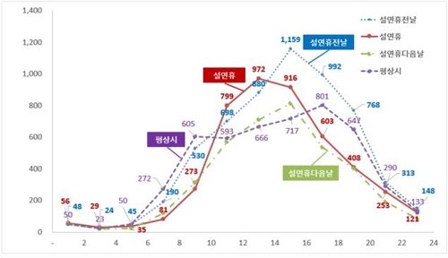 전체 사고 건수 기준 설 전날(8천61건), 설 당일(8천94건), 설 다음날(6천807건), 설 연휴 다음날(8천379건) 등에는 평소보다 사고가 적었다.