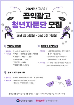 (서울=연합뉴스) 이정현 기자 = 한국방송광고진흥공사(코바코)와 방송통신위원회는 '2025년 공익광고 청년자문단'을 공개 모집한다고 3일 밝혔다.