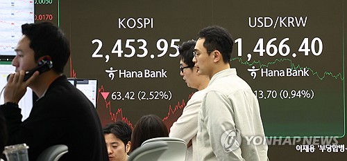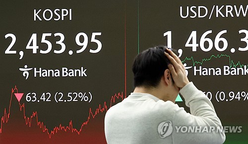 이날 코스피지수는 전장보다 63.42포인트(2.52%) 내린 2,453.95로 장을 마쳤다.