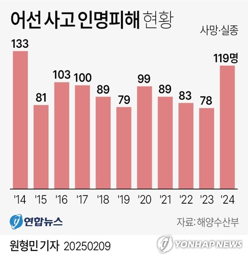 해수부에 따르면 어선 전복과 침몰, 충돌, 안전사고 등으로 인한 사망·실종자는 2023년 78명에서 지난해 119명으로 41명(52%)이나 늘었다.