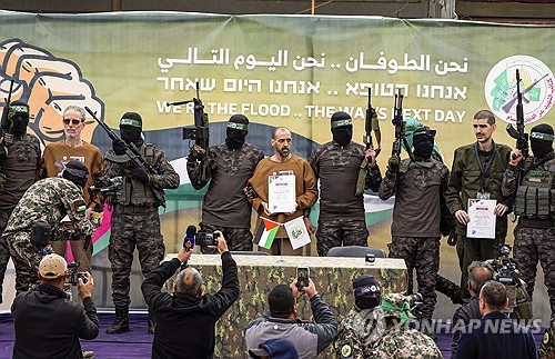 (서울=연합뉴스) 고일환 기자 = 팔레스타인 무장 정파 하마스가 이스라엘 인질을 석방하면서 군중 앞에서 '감사연설'을 강요해 논란이 되고 있다.