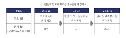 네덜란드는 2023년 6월 최초로 반도체 장비 등 8종에 대한 독자 통제를 시행한 데 이어 작년 9월 첨단 심자외선(DUV) 노광장비 등 총 12종으로 통제 대상을 늘렸다. 이번 조치로 통제 대상은 27종으로 늘어난다.
