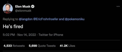 그러자 머스크는 바로 다음날 프론호퍼를 해고했다는 공개 트윗을 올렸다.