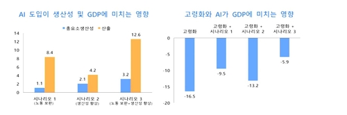 고령화·저출생에 따른 노동 공급 감소가 2023∼2050년 한국 GDP를 16.5% 깎아내릴 것으로 추정되는데, AI가 성공적으로 생산성과 산출을 늘리면 이 감소 폭도 5.9%까지 줄일 수 있다는 게 한은의 분석이다.