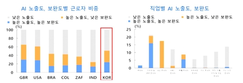 국내 근로자 가운데 27%는 AI 도입으로 대체되거나 소득이 감소하는 '높은 노출도·낮은 보완도' 그룹에, 24%가 AI로 혜택을 받는 '높은 노출도·높은 보완도' 그룹에 속하는 것으로 분석됐다.