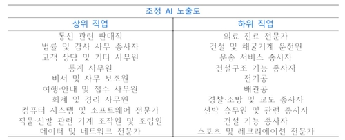 AI 노출·보완도를 종합적으로 고려하면 세부 직업 가운데 통신 관련 판매직·법률 및 감사 사무 종사자·고객 상담 및 기타 사무원·통계 사무원·비서 및 사무 보조원 등의 대체 가능성이 상대적으로 크고, 의료 및 진료 전문가·건설 및 채굴기계 운전원·운송 서비스 종사자·건설구조 기능 종사자 등은 대체 가능성이 작은 것으로 분류됐다.