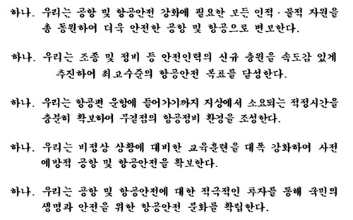 이날 참석자들이 낭독·서명하는 결의문에는 "공항 및 항공안전 강화에 필요한 모든 인적·물적 자원을 총동원해 더욱 안전한 공항 및 항공으로 변모하겠다"는 내용이 담겼다.