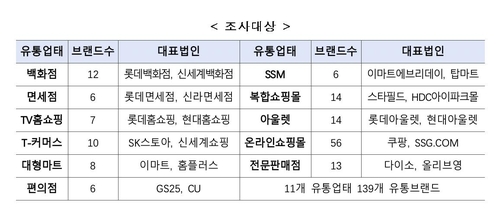 이날 시작하는 조사는 대규모유통업법에 따른 온라인 조사로, 백화점·면세점·TV홈쇼핑·대형마트·온라인쇼핑몰 등 11개 업태 139개 유통브랜드를 대상으로 이날부터 내달 13일까지 한다.