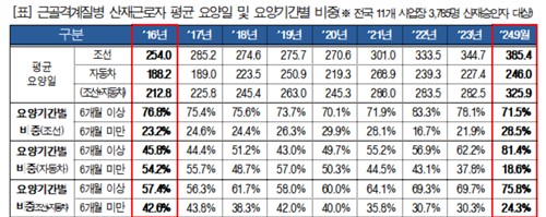 경영계가 조선업계와 자동차 업계를 대상으로 실시한 자체 산재요양 실태조사 결과에 따르면 근골격계 질병 산재근로자의 평균 요양일은 2016년 212.8일에서 2021년 286일, 지난해 9월 말 기준 325.9일 등으로 대체로 꾸준히 증가했다.