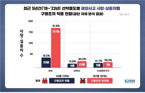 (서울=연합뉴스) 전재훈 기자 = 인명 피해가 발생한 해양 사고 사망·실종자의 81%가 구명조끼를 착용하지 않았던 것으로 집계됐다.