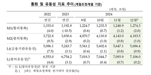 한국은행이 13일 공개한 '통화 및 유동성' 통계에 따르면 작년 12월 평균 광의 통화량(M2 기준·평잔)은 4천183조5천억원으로 전월보다 1.0%(40조5천억원) 많았다. 2023년 6월 이후 19개월째 증가세다.