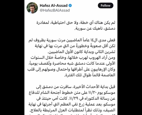 이들 매체에 따르면 하페즈는 삭제된 이전 게시물에서 "시리아를, 다마스쿠스를 떠날 계획은 없었다"며 알아사드 정권 몰락 과정을 돌이켰다.
