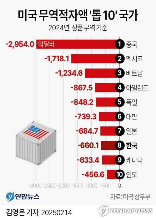 미국 입장에서 한국은 자신들의 무역 파트너 중 무역적자액 '톱 10' 안에 포함돼 있다. 한국은 중국, 멕시코, 베트남, 아일랜드, 독일, 대만, 일본 등에 이어 8위에 자리해 있으며, 작년 한국의 대미 무역 흑자액은 557억 달러(약 81조원)에 달한다.