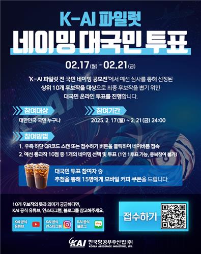 앞서 KAI는 지난 1월 AI 파일럿 네이밍 공모전을 해 모두 4천910건의 응모를 접수했다. 이후 심사위원단 평가를 거쳐 결선 후보 10개 명칭이 우선 선정됐다.
