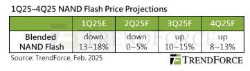 트렌드포스는 이르면 올해 2분기부터 공급업체 감산과 AI 수요가 낸드 가격 회복을 견인할 것으로 관측했다.