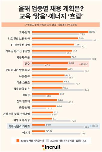 에너지(50.0%)와 정유·화학·섬유(63%) 업종의 채용 계획률도 지난해보다 각각 27.8%포인트, 17.6%포인트 하락했다.