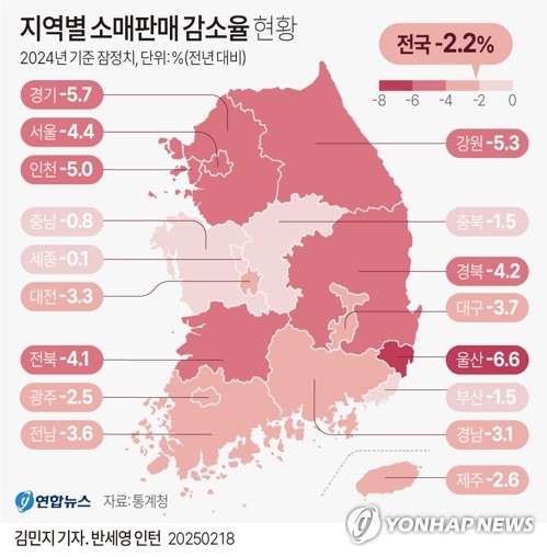 (세종=연합뉴스) 박재현 기자 = 지난해 내수 부진이 장기화하면서 전국 17개 모든 시도에서 소매판매가 전년보다 감소했다.