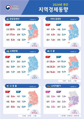 서비스업 생산은 1.4% 증가했다. 제주(4.5%)와 인천(4.3%) 등 8개 시도에서 전년보다 늘었고 세종(-2.6%), 경남(-2.4%) 등 8개 시도는 줄었다.