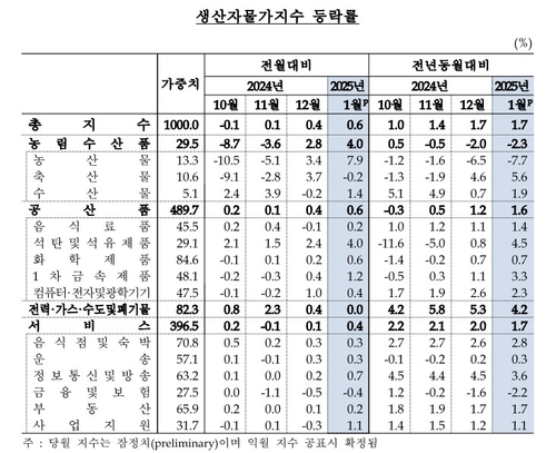 국내 출하에 수출품까지 더한 1월 총산출물가지수 역시 0.7% 높아졌다. 공산품(0.8%)과 서비스(0.4%) 등이 상승했다.