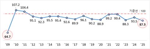 올해 1분기(1∼3월) BSI 전망치는 87.5로, 글로벌 금융위기 당시인 2009년 1분기(64.7) 이후 최저치를 기록했다.