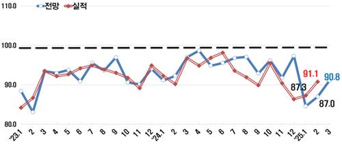업종별 3월 BSI 전망치는 제조업 95.1, 비제조업 86.3을 기록했다.