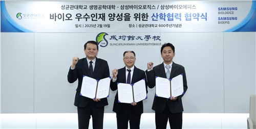 ▲ 삼성바이오로직스[207940]와 삼성바이오에피스는 성균관대학교, 고려대학교와 바이오 연구개발(R&D) 분야 인재 양성을 위한 업무협약을 체결했다고 21일 밝혔다. 협약에 따라 성균관대 생명공학대학과 고려대 생명과학대학 산하에 '바이오 인재 양성 트랙'이 신설된다. 양사는 각 대학 4학년 재학생 중 우수 장학생을 선발해 바이오 R&D 분야 석사 인력을 양성할 계획이다. 장학생에게는 전 학기 등록금과 학비 보조금을 제공하며 졸업과 동시에 입사 기회가 주어진다. (서울=연합뉴스)