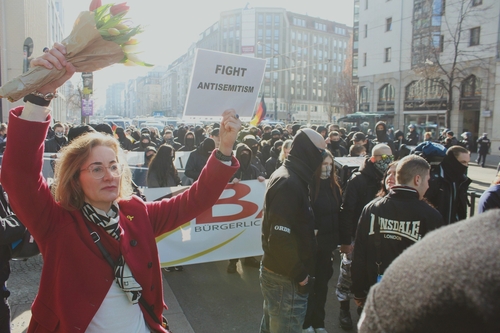곳곳에 시민들이 모인 이유는 베를린 네오나치(신나치)들이 열겠다고 신고한 집회에 맞불을 놓기 위해서다. 같은 시각 프리드리히슈트라세 기차역 광장에서는 네오나치 200여명이 행진을 시작했다. 집회를 조직한 극우 활동가 페르하트 젠튀르크는 참가자들에게 "'이스라엘 국가의 절멸' 같은 구호는 금지된다. 술도 마시면 안 된다"며 집회법을 지켜달라고 신신당부했다. 마스크와 손수건으로 얼굴을 가린 네오나치 상당수는 스무살 안팎으로 보이는 청년들이었다.