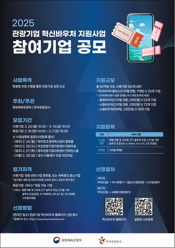 (서울=연합뉴스) 차민지 기자 = 문화체육관광부와 한국관광공사는 관광중소기업의 디지털 전환을 지원하기 위해 '2025년 관광기업 혁신바우처 지원사업'에 참가할 기업 160여개를 다음 달 14일까지 모집한다고 24일 밝혔다.