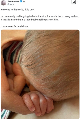 올트먼은 지난 22일(현지시간) 엑스(X·옛 트위터)에 신생아 사진을 올리고 "세상에 온 것을 환영해, 작은 친구야!"라고 썼다.