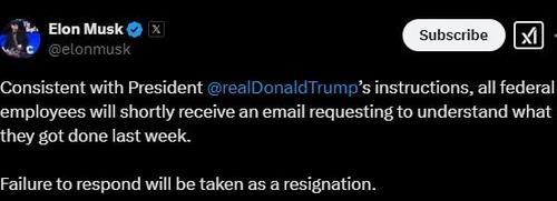 앞서 머스크는 지난 22일 엑스(X·옛 트위터)에 올린 글에서 "대통령 지시에 따라 모든 연방 정부 직원들은 지난주에 한 일을 알 수 있도록 요청하는 이메일을 곧 받을 것"이라며 "회신하지 않을 경우 사직으로 받아들여질 것"이라고 밝혔다.
