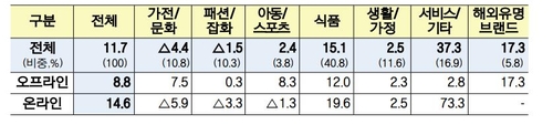 온라인 상품군별 매출은 서비스·기타(73.3%), 식품(19.6%)은 큰 폭의 성장세를 유지했지만 가전·문화(-5.9%), 패션·잡화(-3.3%), 아동·스포츠(-1.3%) 등은 감소했다.