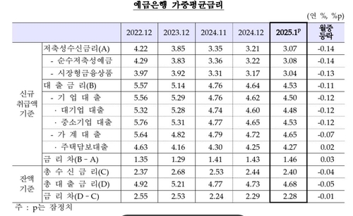 가계대출 4.65%, 0.07%p↓…예금 3.07%, 0.14%p↓ 4개월째 하락