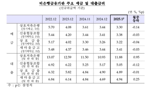 대출금리의 경우 상호저축은행(11.88%·+0.95%p), 새마을금고(4.94%·+0.25%p)에서 오르고 신용협동조합(5.05%·-0.12%p), 상호금융(4.89%·-0.01%p)에서는 떨어졌다.