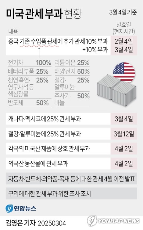 트럼프 대통령은 그러나 멕시코와 캐나다가 불법이민과 마약 단속 등을 위한 국경 안보 강화에 협력하기로 하자 두 나라에 대한 25% 관세를 1개월 유예했고, 중국에 대해서만 지난달 4일 10% 추가 관세 부과를 발효시킨 바 있다.
