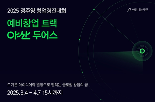 [게시판] 아산나눔재단, 대학생 창업 지원 '아산 두어스' 참가자 모집▲ 아산나눔재단은 글로벌 창업을 목표로 하는 대학생·대학원생을 위한 집중 인큐베이팅 프로그램 '아산 두어스' 참가자를 내달 7일까지 모집한다고 4일 밝혔다. 선발 규모는 총 80명이며, 개인 또는 2∼5인으로 구성된 팀으로 지원할 수 있다. (서울=연합뉴스)(끝)<저작권자(c) 연합뉴스, 무단 전재-재배포, AI 학습 및 활용 금지>