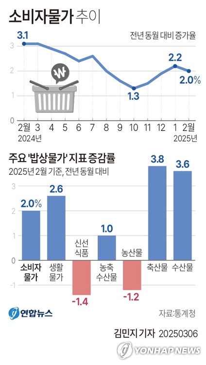 2월 물가상승률 2.0%…근원물가 안정권 속 생활물가 2.6%↑