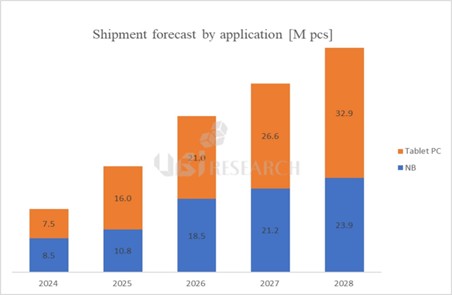 또 올해 노트북과 태블릿용 OLED 출하량은 각각 1천80만대 및 1천600만대로 늘고, 2028년에는 IT용 OLED 출하량이 총 5천만대를 돌파할 것으로 예상했다.