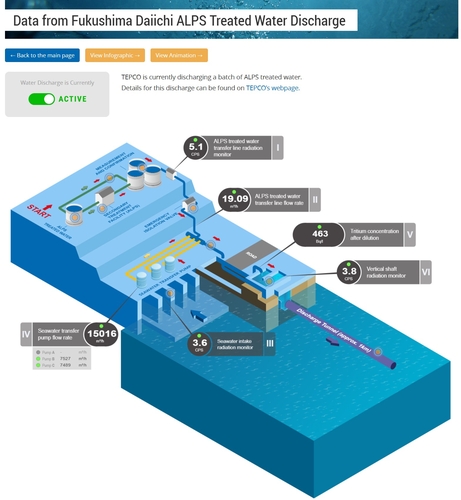 IAEA가 도쿄전력으로부터 실시간으로 제공받는 방류 관련 데이터에서도 희석 오염수 내 삼중수소 농도는 일본 시각 13일 오전 2시 현재 L당 463Bq(베크렐)이었다.