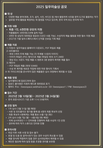 (서울=연합뉴스) 임성호 기자 = 한진그룹 산하 공익재단인 일우재단은 역량 있는 작가를 발굴해 세계적인 작가로 육성하는 '2025 일우미술상' 공모를 오는 24일까지 진행한다고 14일 밝혔다.
