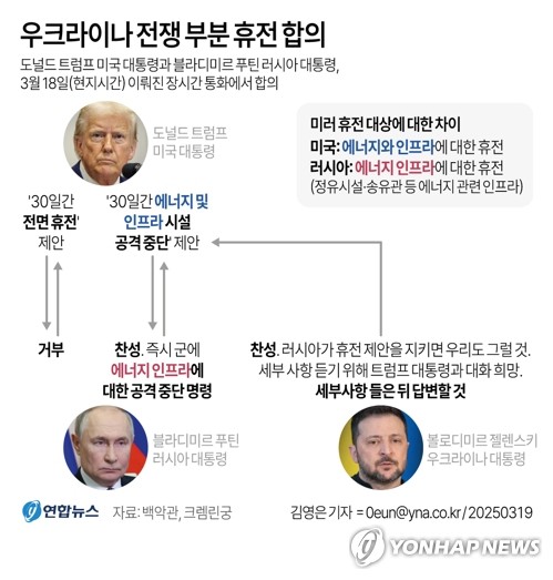 두 사람은 30일간 '에너지 및 인프라'(energy and infrastructure)에 대한 공격 중단이라는 부분 휴전에 합의했다는 것이 백악관의 발표다.