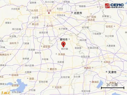 (서울=연합뉴스) 이봉석 기자 = 중국 수도 베이징 인근에서 26일 새벽 규모 4.5(미국 지질조사국 관측 기준·중국 발표는 규모 4.2) 지진이 발생했다고 중국중앙TV(CCTV) 등 중국 매체들이 보도했다.