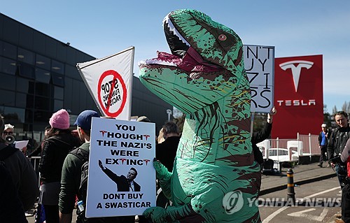 이들은 "일론을 싫어하면 경적을 울려라", "억만장자 '브롤리가르히'(Broligarchy·정치에서 지나칠 정도로 통제력이나 영향력을 행사하는 소수의 부유층 남성 집단을 가리키는 신조어)에 맞서자"라고 쓴 플래카드를 들었다.
